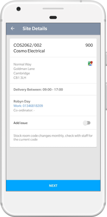Site Details Displays the site address,special instructions, opening hours and contact details. |