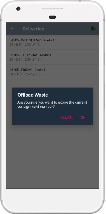 Confirm offload Click the Ok button to confirm that you want to offload the waste |
