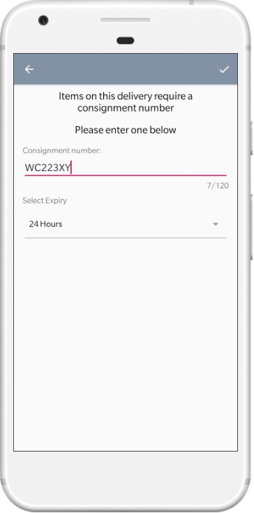 Enter consignment number If the route you selected had any hazardous waste deliveries that require a consignment number you will be asked to enter a consignment number and the length of validity. Then click the tick button. |