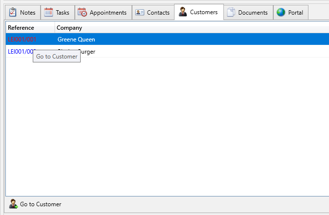 On the Contractors screen, the Customers tab has a list of the customers for the selected Contractor. By clicking on the hyperlink, the screen changes to the Customer Tab with the customer details displayed. You can also right click the customer and choose Go to Customer