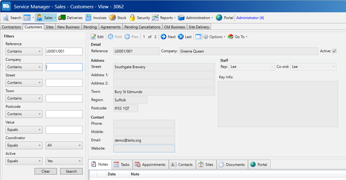 After clicking the link, the screen changes to the Customer page with the requested record loaded, in this case, LEI001/001
